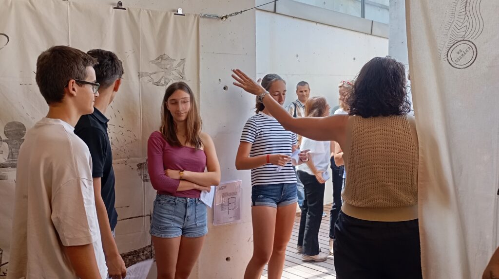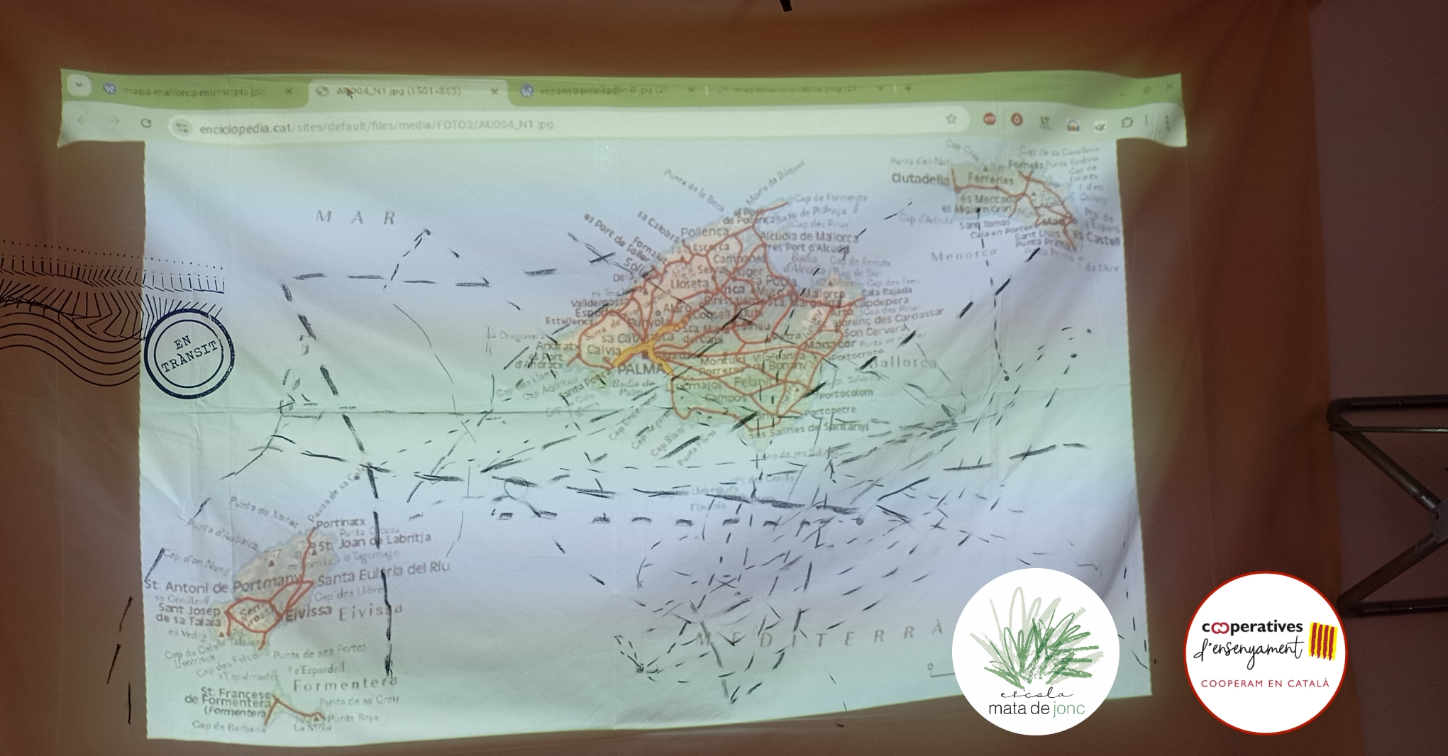 Al centre de la tela, l’alumnat va traçar amb carbonet els recorreguts migratoris de les seves pròpies famílies, inspirant-se en el projecte Mapping Journey de Bouchra Khalili. Aquest exercici senzill, però profund, va fer evident que, d’una manera o altra, totes i tots tenim una història de desplaçament a les nostres famílies: de la Part Forana a Ciutat, de la península a l’illa, o d’altres continents fins aquí. Ǫualcunes d’aquestes històries eren de generacions anteriors; d’altres, pròpies.